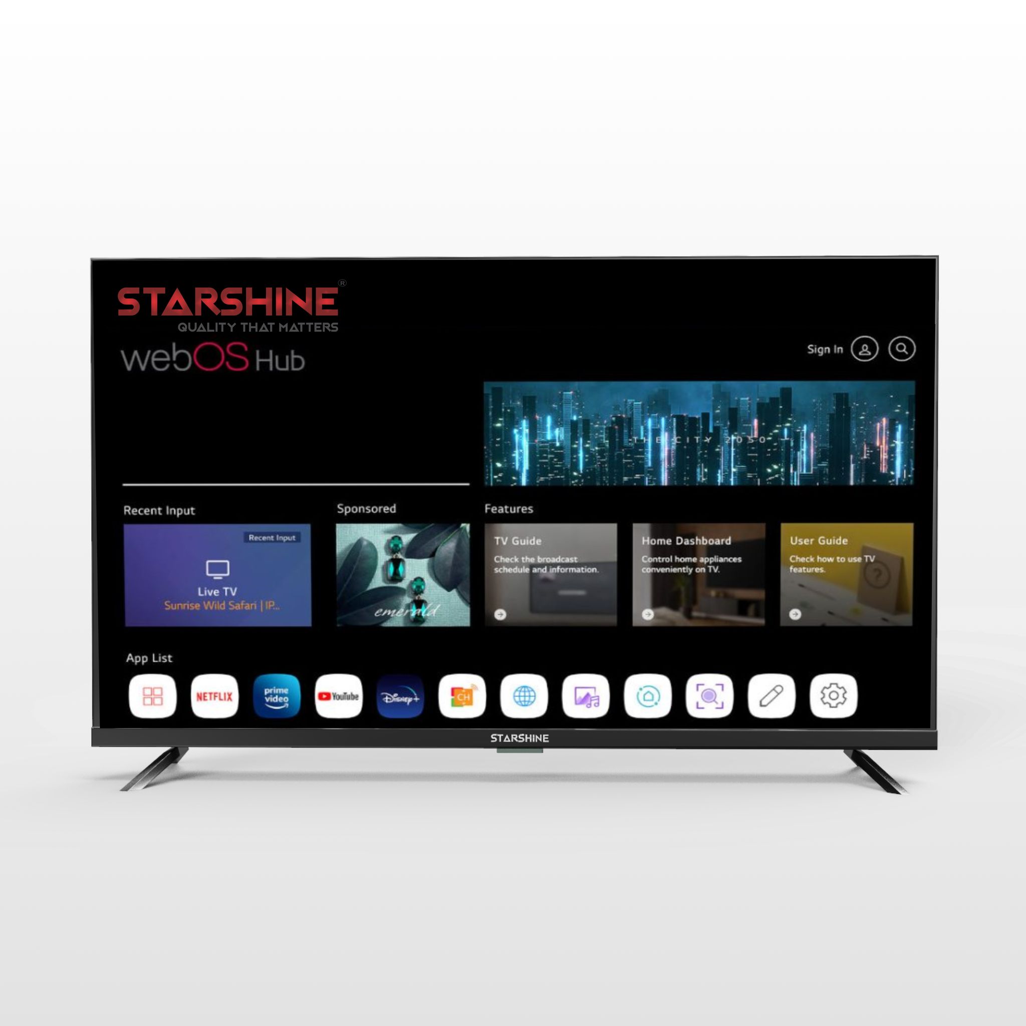 The Starshine 55" Smart TV is the perfect choice for the modern home. It comes equipped with the innovative webOS, which gives you access to your favorite streaming services like Netflix, Amazon Prime Video, Zee5, Disney+ Hotstar. The Magic Remote makes navigating the Smart TV a breeze with quick and intuitive navigation. Enjoy ultra-high definition with 4K resolution, so that you can experience stunning clarity and an immersive viewing experience. And with the Thinq AI, you can easily search for content, ask questions, and get the most out of your Smart TV.
